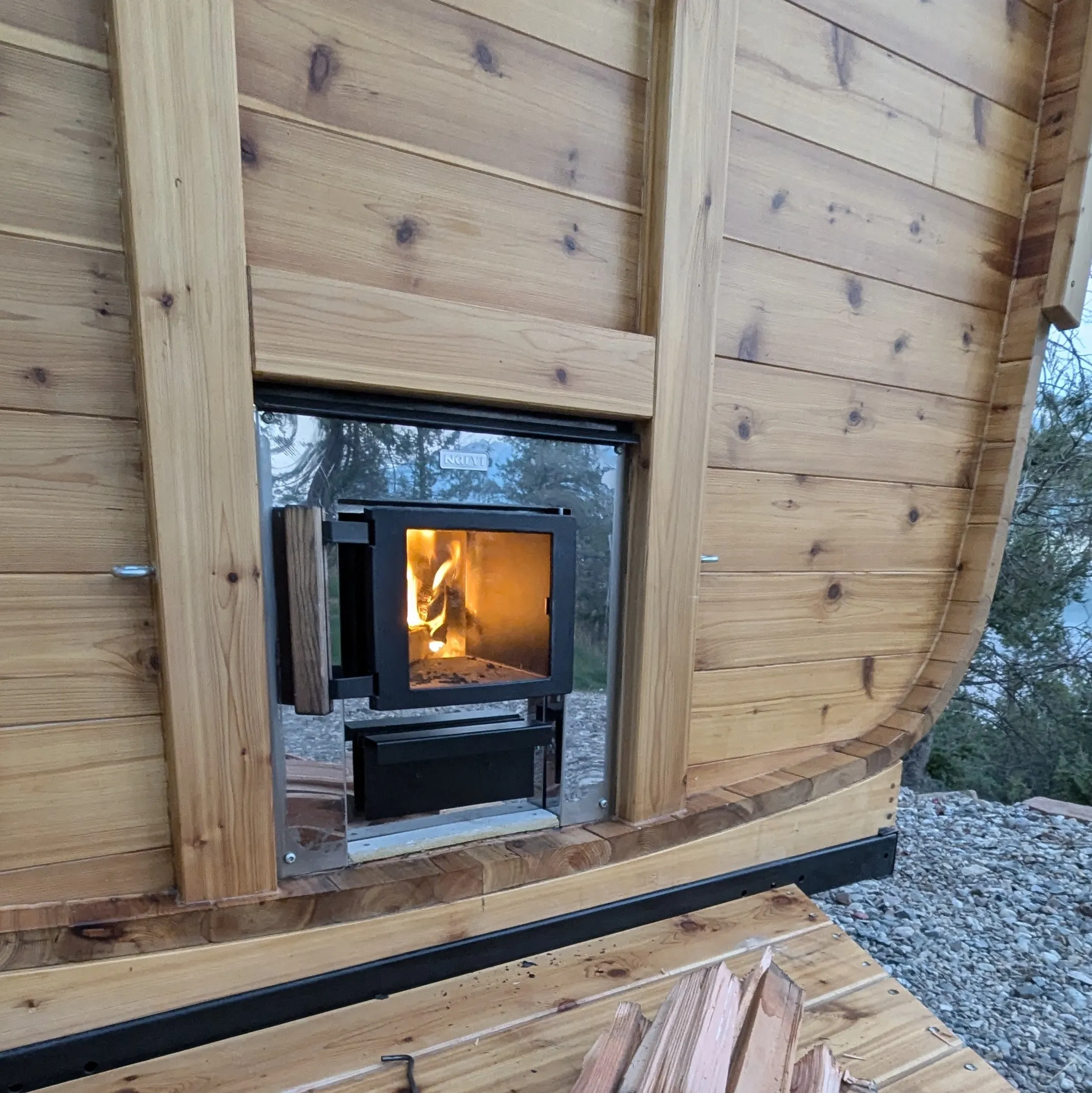 - Wood-fired stove, fed from the outside